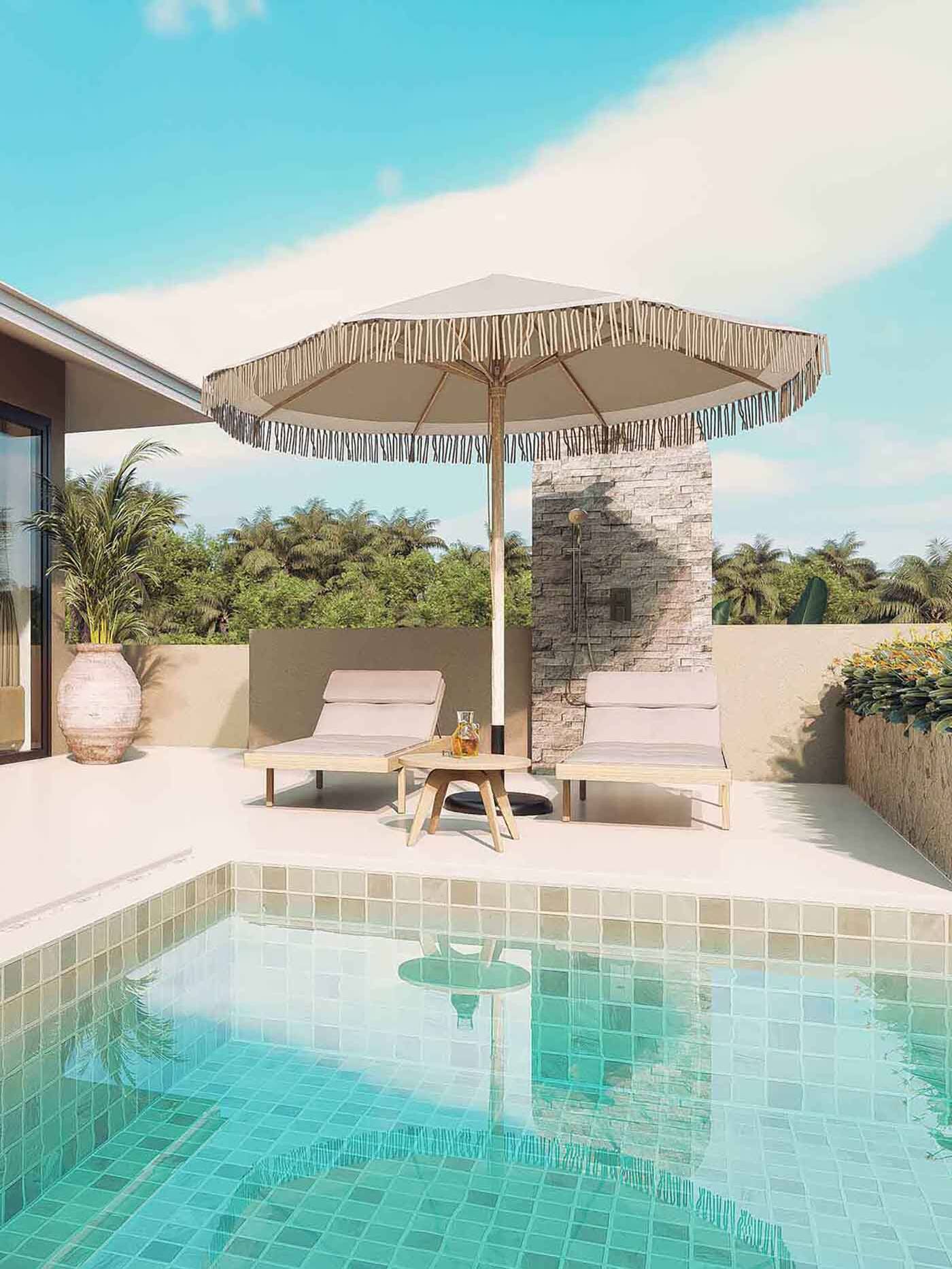 - Large pool terrace and outdoor shower