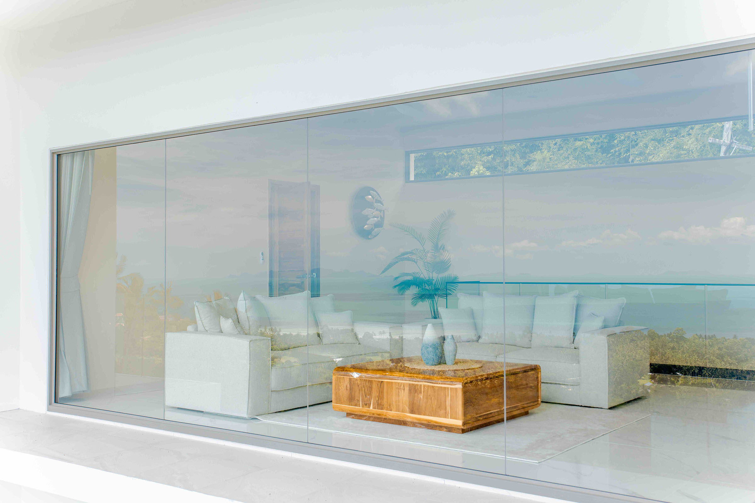 The villa sits in a tranquil hillside setting on the island’s sunset side, gently elevated above the coast with moderately steep access.