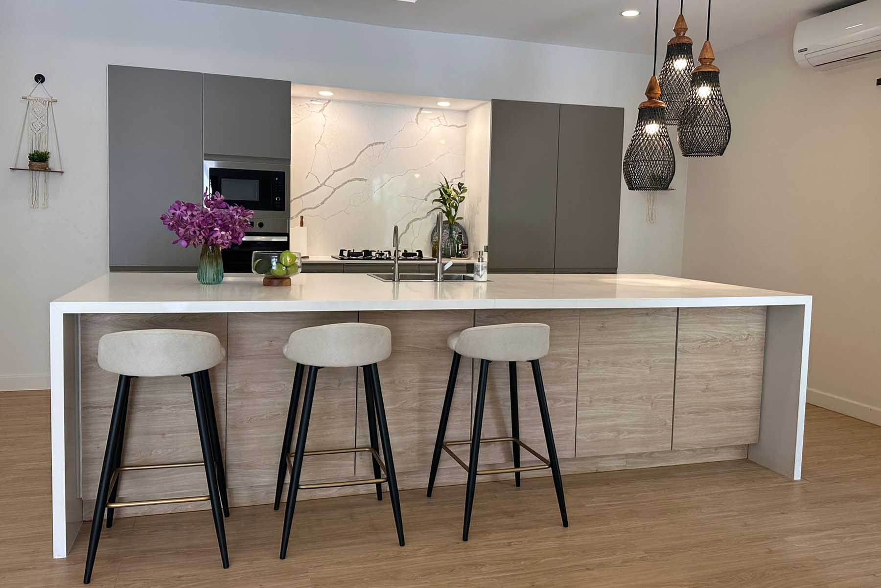 The kitchen is every chef’s dream and comes with inbuilt appliances and large kitchen island.