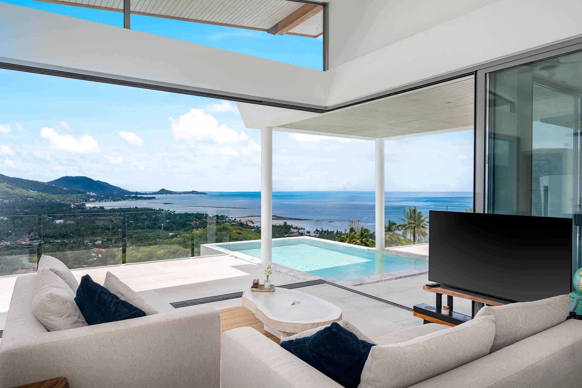 Villa Skyfall occupies an elevated hillside position on Koh Samui’s south-east coast, commanding panoramic views that stretch across the surrounding landscape and out to sea.The architecture is carefully oriented to frame the landscape, creating a seamless dialogue between interior spaces and the expansive surroundings.