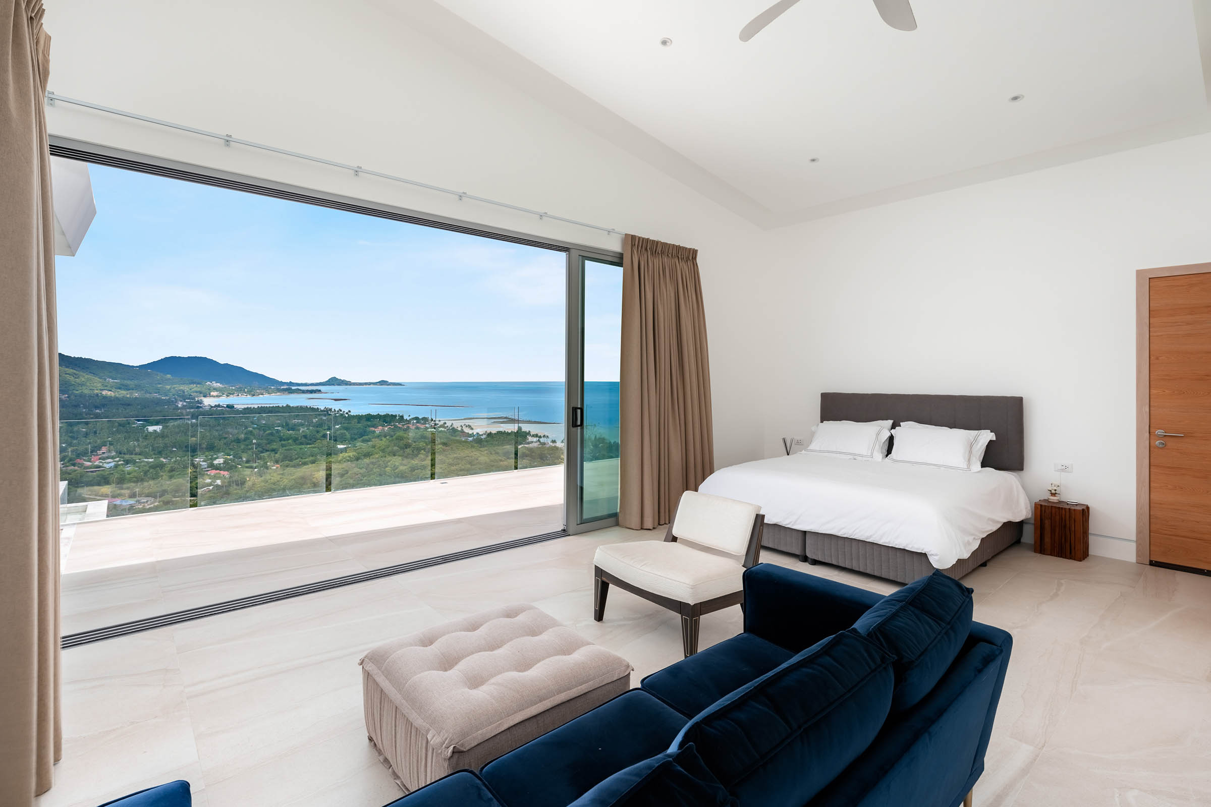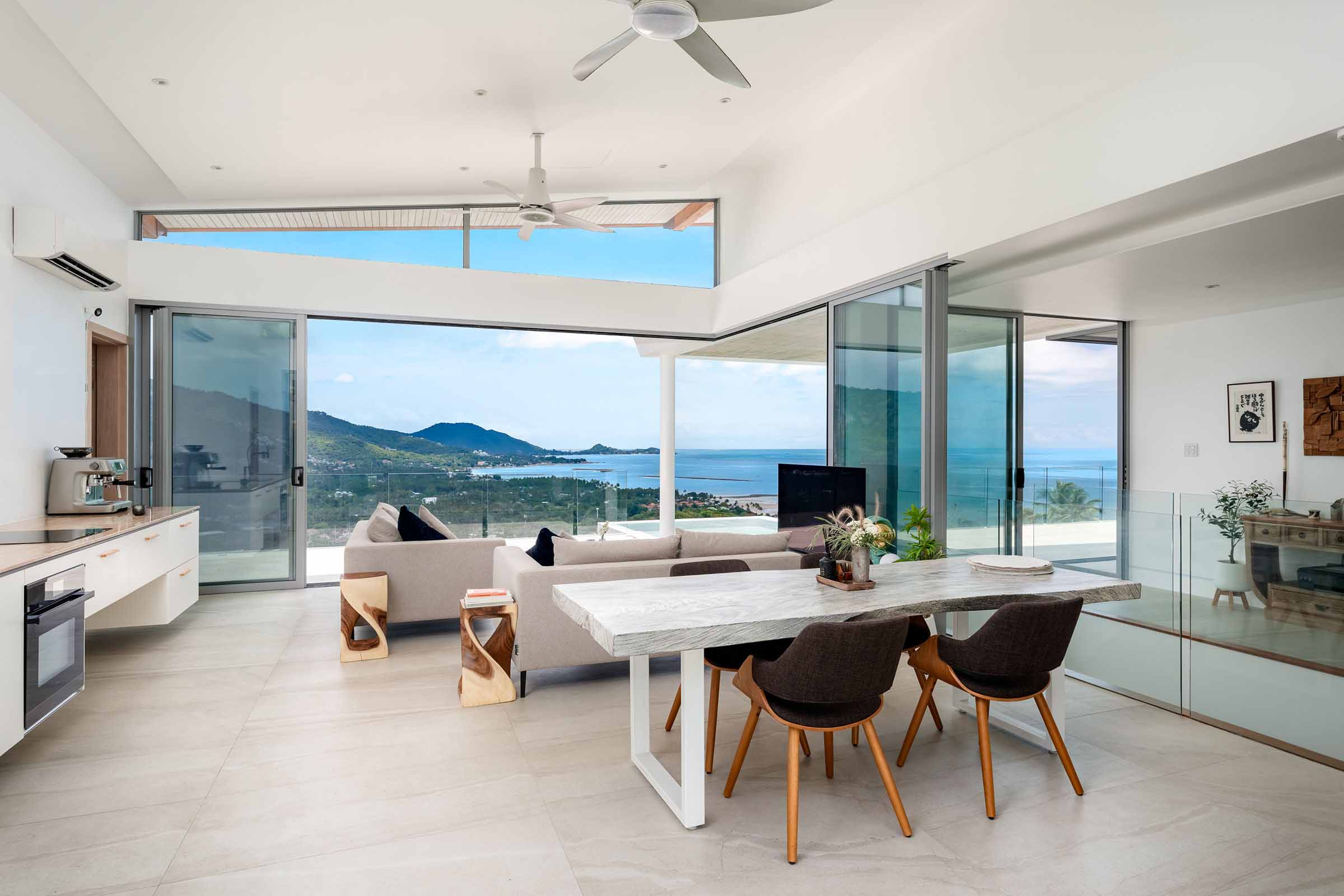 Floor-to-ceiling sliding doors with high-performance double glazing create a fluid connection between indoor and outdoor living spaces, framing uninterrupted views of the sea from every room.
